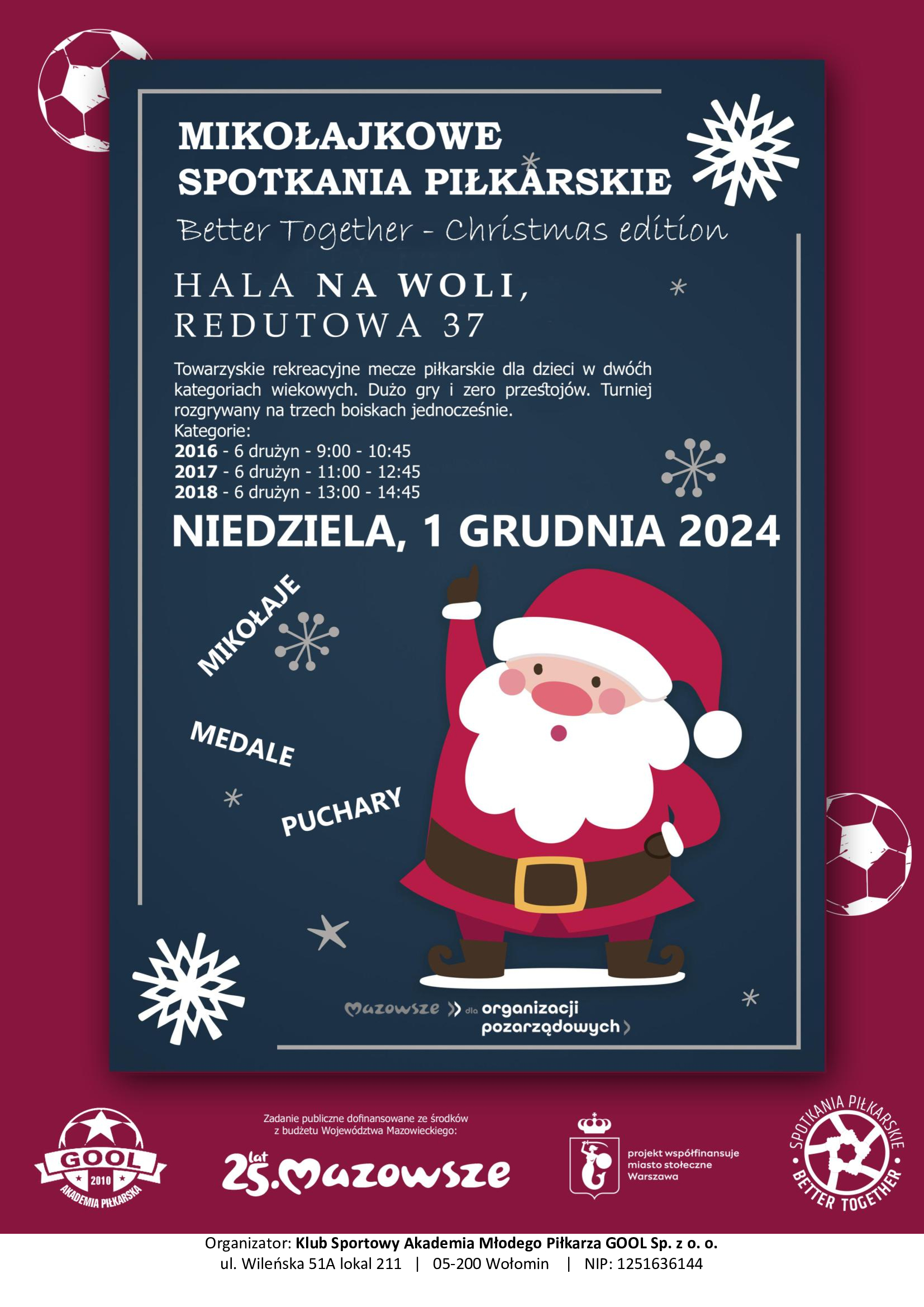 Zapraszamy na Mikołajkowe Spotkania Piłkarskie! Już 1 grudnia 2024 roku na hali Redutowa 37 w Warszawie na Woli odbędzie się kolejna edycja naszej wyjątkowej imprezy sportowej!
