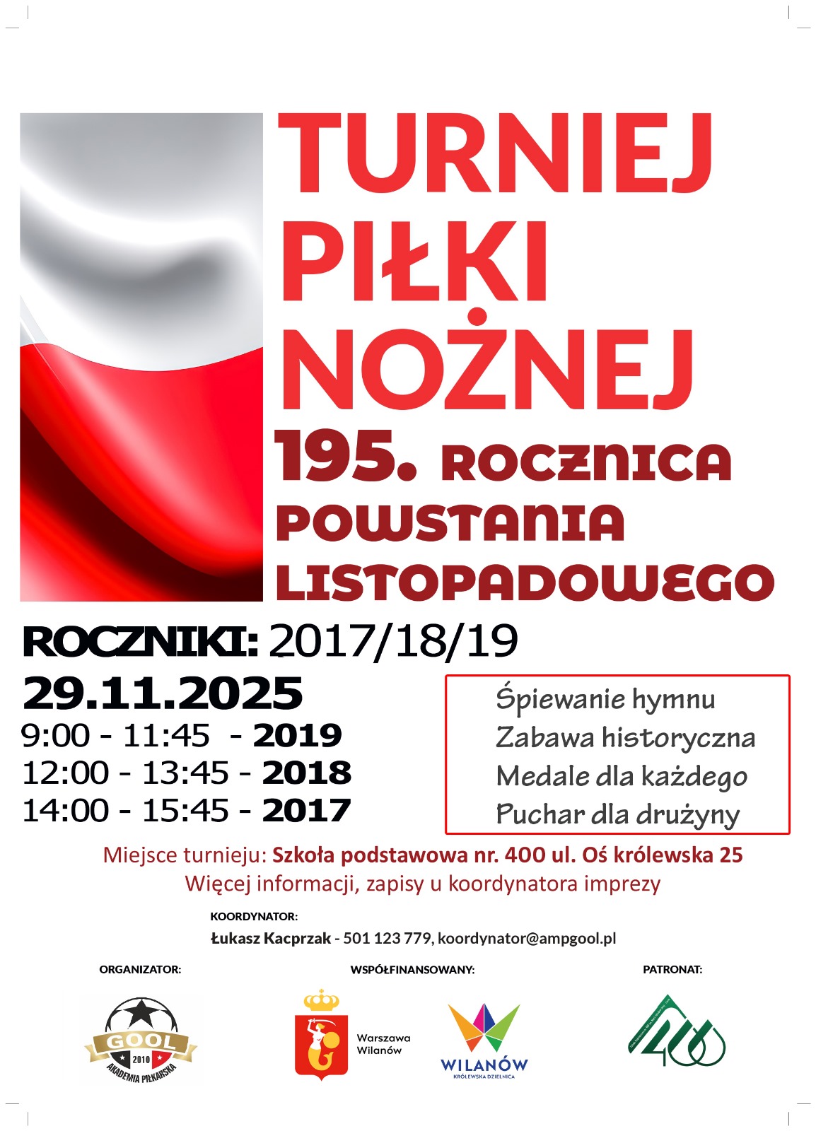 Już w najbliższą sobotę (29.11.2025) zapraszamy wszystkich serdecznie na Turniej piłki nożnej upamiętniający rocznicę Powstania Listopadowego, który odbędzie się na warszawskim Wilanowie. Jednego dnia zaplanowano rozgrywki dla rocznika 2017 -2019 . Gramy w systemie 3+1 na bramki 3×1,55.