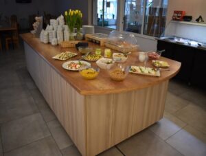 Obiady podawane są w formie bufetu i obejmują do wyboru: aromatyczną zupę, dwa dania główne, dwie surówki oraz zimne napoje — sok i/lub wodę.